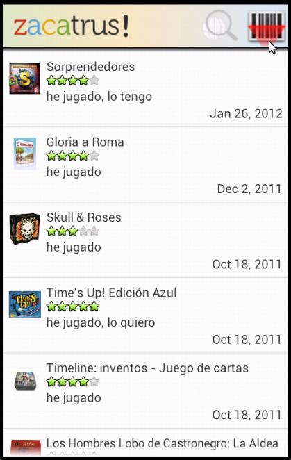 - Buscar juegos. A mano o con el lector de código de barras. En el catálogo de Zacatrus! o también en la base de datos de la Board Game Geek.